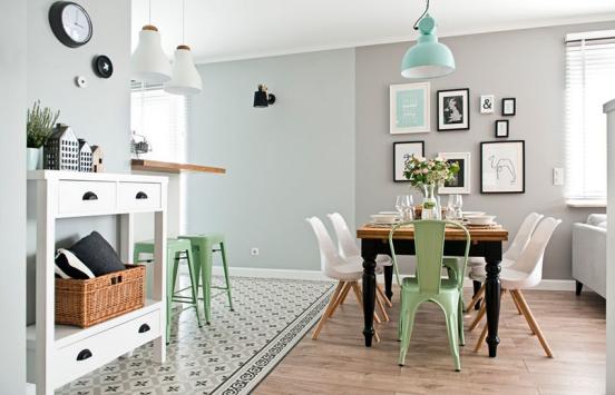 薄荷綠餐椅搭配同色系的吊燈,靠墊,裝飾畫,再通過一系列的點綴,讓空間舒適整潔又沁人心脾。