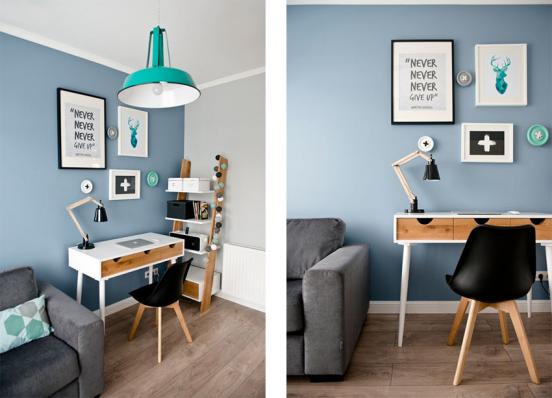 從客廳至廚房再到書房,設計師都沒有脫離薄荷綠的主題。書房以灰藍色為墻面,選用灰色布藝沙發(fā),再搭配木質休閑椅,幾幅裝飾畫的點綴也讓小空間提升了一個格調。