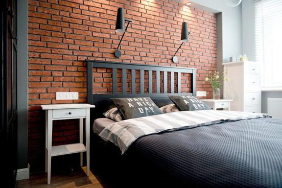 再來看一下臥室,相比于小清新的公共空間,臥室似乎“狂野”了許多,紅色磚墻和黑色床打造出帥氣硬朗的工業(yè)風空間。一個屋檐下兩種截然不同風格的碰撞,強烈的視覺反差讓屋主充滿驚喜。
