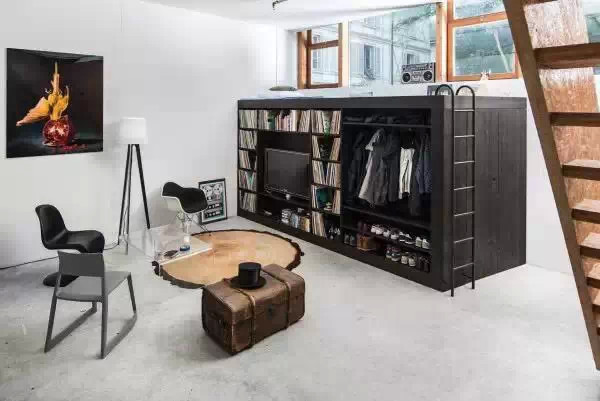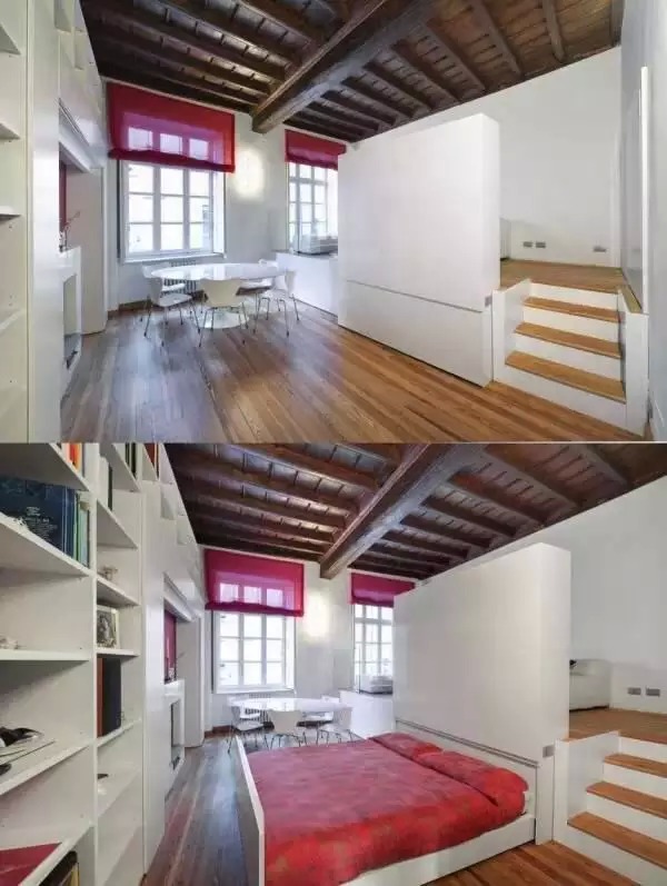 在這個狹窄的空間你能找到床、儲物柜、掛衣區(qū),這樣的布局高效的利用了窗邊空間。配上了經(jīng)典家居:S型椅、伊姆斯餐椅,更顯現(xiàn)代又創(chuàng)意。
