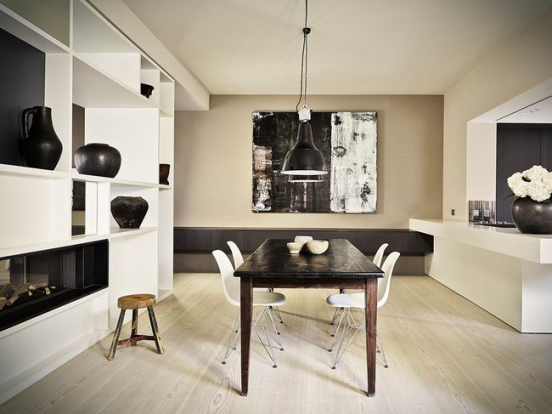 最后來(lái)看一下餐廳,與客廳以鏤空儲(chǔ)物架隔開(kāi),復(fù)古的黑色木桌,搭配現(xiàn)代簡(jiǎn)約的白色伊姆斯餐椅,迸發(fā)復(fù)古與現(xiàn)代的火花,墻上的版畫(huà)與整體的黑白碰撞呼應(yīng),帶來(lái)強(qiáng)烈的視覺(jué)效果,充滿(mǎn)藝術(shù)氣息。