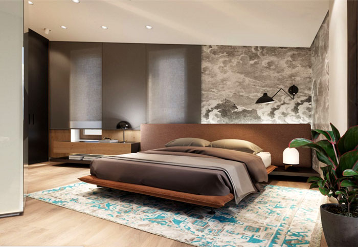 如你所見(jiàn),當(dāng)布藝沙發(fā)遇上高貴的紫色,空間的低調(diào)奢華不言而喻。視線(xiàn)所及,還有木質(zhì)地板,混凝土墻面,鐵制儲(chǔ)物架,設(shè)計(jì)師運(yùn)用大量不同的材質(zhì),讓整個(gè)公寓看起來(lái)豐富而質(zhì)感。